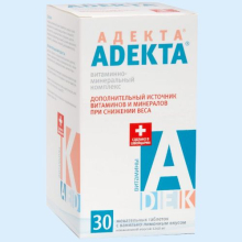 | Фармакологическое действие. | Адекта - дополнительный источник витаминов и минералов при снижении веса. Действие витаминно-минерального комплекса Адекта обусловлено эффектами входящих в его состав витаминов и минералов. Витаминно-минеральный комплекс Адекта сбалансирован – действие одного компонента дополняется и усиливается действием другого. Каждый компонент оказывает определенный, четко выраженный эффект на организм. Все витамины подразделяются на два класса в зависимости от их растворимости. Жирорастворимые (липофильные) – для их успешного всасывания необходимо достаточное количество жира в организме. К ним относятся витамины A, D, E и K. Водорастворимые (гидрофильные) – легко растворимы в воде, вследствие чего быстро выводятся из организма. В эту группу входят все витамины группы B (В1, В2, В6, В12, В9 (фолиевая кислота), В5 (пантотеновая кислота), витамин РР), витамин С и биотин. В процессе снижения веса организм вместе с лишними килограммами теряет не только водорастворимые витамины и минералы из-за ограниченного и несбалансированного рациона питания, но и важнейшие жирорастворимые витамины в связи с потерей жиров. Низкожировая диета и лекарственные средства, способствующие выведению жира и жирных кислот из организма (например, препараты, содержащие орлистат), могут привести к снижению всасываемости жирорастворимых витаминов. Для обеспечения адекватного поступления витаминов в организм, рекомендуется принимать витаминно-минеральные комплексы, содержащие в своем составе необходимые количества жирорастворимых и водорастворимых витаминов и минералов. Витаминно-минеральный комплекс Адекта® является дополнительным источником жирорастворимых, водорастворимых витаминов, цинка и источником глицирризиновой кислоты, особенно, в случае недостаточного поступления и/или избыточной потери жирорастворимых витаминов. |