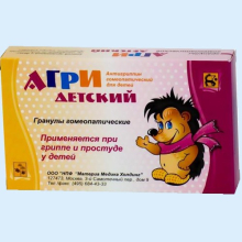 | Фармакологическое действие. | Агри детский (Антигриппин гомеопатический) обладает жаропонижающим и противовоспалительным действием на начальной и развернутой клинической стадии острых респираторных заболеваний. |