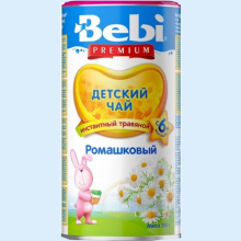 Получить консультацию по данному препарату| Состав и форма выпуска. | Чай детский Bebi Premium ромашковый с 6 мес. 200 г. Состав: декстроза (65,5%), сахароза (29%), экстракт ромашки (5%), сироп глюкозы (0,5%) . Пищевая ценность (средние значения на 100 мл)белки <0,1 г, углеводы 4,7 г, в том числе сахароза 4,5 г, жиры <0,1 г, энергетическая ценность 19 ккал / 80 кДж |