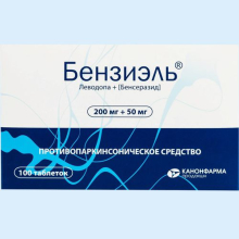 | Способ применения. | Внутрь, не менее чем за 30 мин до или через 1 ч после еды, таблетки можно размельчать для облегчения глотания. Болезнь Паркинсона: Стандартный режим дозирования. Лечение следует начинать с малой дозы, постепенно увеличивая дозу для каждого пациента индивидуально до достижения терапевтического эффекта. Начальная терапия: На ранней стадии болезни Паркинсона рекомендуется начинать лечение препаратами леводопы/бенсеразида с приема 62,5 мг (50 мг леводопы + 12,5 мг бенсеразида) 3-4 раза в сутки. При переносимости схемы начального дозирования дозу нужно медленно увеличивать в зависимости от реакции пациента. Оптимальный эффект обычно достигается при суточной дозе в 300-800 мг леводопы + 75-200 мг бенсеразида, принимаемой в три или более приемов. Для достижения оптимального эффекта может потребоваться от 4 до 6 недель. При необходимости дальнейшего увеличения суточной дозы это следует делать с промежутками в 1 месяц. Поддерживающая терапия. Средняя поддерживающая доза - 125 мг (100 мг леводопы +- 25 мг бенсеразида) 3-6 раз в сутки. Число приемов (не менее трех) и их распределение в течение дня должно обеспечить оптимальный эффект. Синдром беспокойных ног. Максимально допустимая доза в сутки - 500 мг препарата Бензиэль (400 мг леводопы + 100 мг бенсеразида). За 1 ч до сна с небольшим количеством пищи. Перед применением препарата Бензиэль следует воздержаться от приема пищи, богатой белком. Идиопатический синдром беспокойных ног с нарушениями засыпания. Начальная доза препарата Бензиэль: 62,5 мг (50 мг леводопы + 12,5 мг бенсеразида) - 125 мг (100 мг леводопы + 25 мг бенсеразида). При недостаточном эффекте следует увеличить дозу препарата до 250 мг (200 мг леводопы + 50 мг бенсеразида). Идиопатический синдром беспокойных ног с нарушениями засыпания и сна. Начальная доза препарата Бензиэль: 125 мг (100 мг леводопы + 25 мг бенсеразида). При недостаточном эффекте рекомендуется увеличить дозу препарата до 250 мг (200 мг леводопы + 50 мг бенсеразида). Идиопатический синдром беспокойных йог с нарушениями засыпания и сна, а также с нарушениями в течение суток. Дополнительно: 125 мг (100 мг леводопы + 25 мг бепсеразида), максимально допустимая суточная доза - 500 мг (400 мг леводопы + 100 мг бепсеразида) препарата Бензиэль. Синдром беспокойных ног у пациентов с хронической почечной недостаточностью, получающих диализ. 125 мг препарата Бензиэль (100 мг леводопы + 25 мг бепсеразида) за 30 минут до начала диализа. Дозирование в особых случаях. Болезнь Паркинсона. Препарат Бензиэль можно комбинировать с другими противопаркинсоническими средствами, по мере продолжения лечения может возникнуть необходимость в уменьшении дозы других препаратов или их постепенной отмене. У пациентов с почечной недостаточностью легкой или умеренной степени тяжести коррекции дозы не требуется. Препарат Бензиэль® хорошо переносится пациентами, находящимися на гемодиализе. При длительном лечении возможно появление флюктуаций - эпизодов застывания, ослабления эффекта к концу периода действия дозы, феномена включения-выключения. Для устранения этих симптомов пли уменьшения их выраженности следует провести коррекцию дозы, возможно, путем назначения меньших доз, но чаще. Впоследствии можно попробовать вновь увеличить дозу для усиления терапевтического эффекта. Синдром беспокойных ног. Для исключения нарастания 