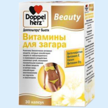 | Фармакологическое действие. | Доппельгерц Бьюти Витамины для загара входящие в состав компоненты повышают сопротивляемость организма воздействию внешней среды, солнечного света и УФ-лучей солярия. Бета-каротин. Участвует в обменных процессах клеток кожи, способствует ее обновлению. Бета-каротин служит предшественником витамина А (ретинол) и является мощным антиоксидантом, поддерживает деятельность иммунной системы, обладает адаптогенным действием. Имеются данные, что каротины замедляют процессы старения, поддерживают нормальное состояние кожи и слизистых оболочек. Витамин Е (токоферол) С. Является антиоксидантом. В механизме действия токоферолов существенным является их нормализующее влияние на окислительно-восстановительные процессы. Токоферолы, обладая антиоксидантным действием, предохраняют биологически активные вещества, в том числе ненасыщенные жирные кислоты от окисления. Витамин Е также расширяет кровеносные сосуды, повышая кровоток, снижает возможность тромбообразования. Он улучшает эластичность кожи, замедляет старение клеток, защищает от токсических агентов внешней среды, таких как радиация и повышенная активность солнечных лучей, препятствует шелушению, способствует восстановлению клеток кожи. Селен. Основная функция селена как микроэлемента связана с участием в антиоксидантных процессах. Известно, что свободные кислородные радикалы могут отрицательно сказываться на функциях организма. В связи с этим, антирадикальные способности селена существенно помогают в борьбе с вредными внешними факторами, к числу которых можно отнести и повышенную солнечную радиацию. Этот элемент стимулирует образование антител, необходим для нормального функционирования организма и обеспечения эластичности кожных покровов. Витамин D3. Образуется в коже под воздействием солнечного света. Влияет на общий обмен веществ, регулирует кальций-фосфорный обмен, обеспечивает нормальный рост и развитие костей, снижает риск развития остеопороза, необходим для нормального функционирования паращитовидной железы. |