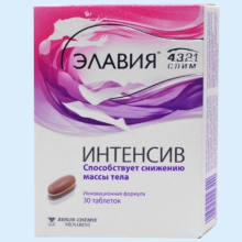 | Фармакологическое действие. | Элавия 4.3.2.1. Слим Интенсив - многослойные таблетки, изготовленные на основе растительных экстрактов по инновационной технологии, формула которых направлена на потерю избыточного веса. Применение средства улучшает липидный обмен, способствует выведению избыточной жидкости, регулированию усвоения углеводов, освобождению организма от побочных продуктов обмена веществ. Элавия 4.3.2.1. Слим Интенсив поможет Вам достигнуть идеального веса и улучшить пропорции фигуры, если применять его в сочетании со сбалансированным питанием, благодаря физиологическому воздействию сразу в четырех направлениях: Способствует снижению жировой массы тела. Регулирует усвоение углеводов. Способствует уменьшению объемов талии и бедер. Улучшает самочувствие на фоне соблюдения диеты. Данное средство будет способствовать Вашей программе похудения только в том случае, если оно будет использоваться как часть диеты с ограничением потребления калорий. Биологически активная добавка к пище, не может служить заменой разнообразного и сбалансированного питания и альтернативой здорового образа жизни. |
