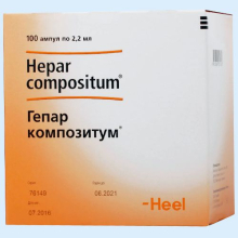 Получить консультацию по данному препарату| Состав и форма выпуска. | Форма выпуска: Раствор для внутримышечного и подкожного введения гомеопатический. Состав: На одну ампулу 2,2 мл (= 2,2 г): Активные компоненты: HeparsuisD8 22 мкл, Cyanocobalaminum (Cyanocobalamin) D4 22 мкл, DuodenumsuisD10 22 мкл, ThymussuisD10 22 мкл, ColonsuisD10 22 мкл, VesicafelleasuisD10 22 мкл, PankreassuisD10 22 мкл, Cinchonapubescens (China) D4 22 мкл, Lycopodiumclavatum (Lycopodium) D4 22 мкл, Chelidoniummajus (Chelidonium) D4 22 мкл, Silybummarianum (Carduusmarianus) D3 22 мкл, Histamin (Histaminum) D10 22 мкл, SulfurD13 22 мкл, AvenasativaD6 22 мкл, FeltauriD8 22 мкл, Natriumdiethyloxalaceticum (Natriumoxalaceticum) D10 22 мкл, Aciduma-ketoglutaricumD10 22 мкл, AcidumDL-malicumD10 22 мкл, AcidumfumaricumD10 22 мкл, AcidumDL-?-liponicum (Acidum-?-liponicum) D8 22 мкл, AcidumoroticummonohydricumD6 22 мкл, Cholesterolum (Cholesterinum) D10 22 мкл, CalciumcarbonicumHahnemanni (Conchae) D28 22 мкл, Taraxacumofficinale (Taraxacum) D4 22 мкл, CynarascolymusD6 22 мкл, VeratrumalbumD4 22 мкл. Вспомогательные компоненты: вода для инъекций 1628 мг, натрия хлорид для установления изотонии. Упаковка: В пачке картонной 100 ампул по 2,2 мл. |