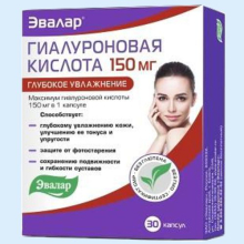 Получить консультацию по данному препарату| Состав и форма выпуска. | Форма выпуска: Капсулы. Упаковка. 30 шт. Состав: 1 капсула содержит: Биоформула «Эвалар» высокомолекулярная и низкомолекулярная гиалуроновая кислота 150 мг. |