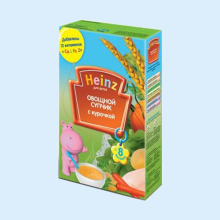 | Описание. | Овощные супы отличны от обычных каш своим составом — это главным образом овощи, а не зерно. Они дополнят рацион питания малыша, внеся в него разнообразие. Суп Heinz овощи-курица рекомендован детям с 8 месяцев. Содержит необходимые питательные вещества и витамины для здоровья малыша. Суп дополнительно обогащен минералами железа, цинка, йода и кальция, витаминами группы В и витаминами А, Е, С, D, и РР, а также пантотеновой кислотой, фолиевой кислотой и биотином. Суп Хайнц овощи-курица не содержит красителей, консервантов и вкусовых добавок. Содержит глютен и молоко. |