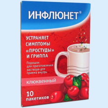 Получить консультацию по данному препарату| Состав и форма выпуска. | Форма выпуска: Инфлюнет. Порошок для приготовления раствора для приема внутрь, клюквенный. Упаковка: 5 г - пакетики термосвариваемые из комбинированного материала (10) - пачки картонные. Состав: Действующие вещества: парацетамол – 350 мг, аскорбиновая кислота – 300 мг, янтарная кислота – 120 мг, рутозида тригидрат (в пересчете на рутозид) – 20 мг, фенилэфрина гидрохлорид – 5 мг вспомогательные вещества: ароматизатор клюквенный – 60 мг, аспартам – 30 мг, гипролоза – 30 мг, кремния диоксид коллоидный – 10 мг, лактозы моногидрат – 4075 мг. |