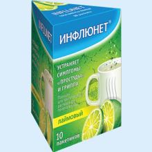 Получить консультацию по данному препарату| Состав и форма выпуска. | Форма выпуска: Инфлюнет. Порошок для приготовления раствора для приема внутрь, лайм. Упаковка: 5 г - пакетики термосвариваемые из комбинированного материала (10) - пачки картонные. Состав: Действующие вещества: парацетамол – 350 мг, аскорбиновая кислота – 300 мг, янтарная кислота – 120 мг, рутозида тригидрат (в пересчете на рутозид) – 20 мг, фенилэфрина гидрохлорид – 5 мг вспомогательные вещества: ароматизатор клюквенный – 60 мг, аспартам – 30 мг, гипролоза – 30 мг, кремния диоксид коллоидный – 10 мг, лактозы моногидрат – 4075 мг. |