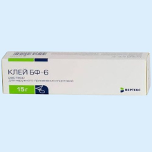 | Показания препарата. | Клей БФ-6 применяют для обработки микротравм - ссадин, царапин, порезов и других мелких повреждений кожи, а также для покрытия корня зуба при хирургическом лечении околокорневых зубных очагов инфекции: кист, гранулем. |