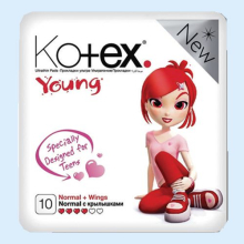 Получить консультацию по данному препарату| Фармакологическое действие. | Прокладка Kotex Young чуть больше уже обыкновенной прокладки, что более комфортабельно для девушек-подростков, а усиленный поглощающий слой в центре обеспечивает надежную защиту от протеканий. Прокладки Котекс сделаны с применением технологии Двойного Эффекта: особая сеточка в центре прокладки мгновенно проводит жидкость вовнутрь, оставляя поверхность сухой, а мягенькие, как хлопок, края и крылышки помогают избежать раздражения кожи там, где появляется трение. |