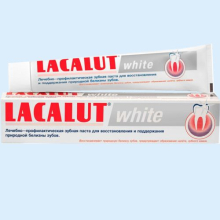Получить консультацию по данному препарату| Состав и форма выпуска. | Лекарственная форма: лечебно-профилактическая зубная паста для восстановления и поддержания природной белизны зубов+ бальзам для губ. Состав: В состав пасты лакалют вайт входят специальные микроскопические частицы – абразивы, которые удаляют с поверхности зубов бактериальный налет и вдобавок нежно полируют эмаль, чтобы она была гладкой и блестящей. У пасты LACALUT white дорогостоящий абразив с регулируемой сферической огранкой, он не царапает и не травмирует эмаль. Размер и форма абразивных частиц обеспечивают сверхпродуктивное и бережное отбеливание. Помимо этого лакалют вайт содержит фториды, укрепляющие эмаль зубов и предупреждающие их повышенную чувствительность, а также пирофосфаты – специальные соединения, препятствующие образованию зубного камня. Присутствие в пасте лактата алюминия позволяет эффективно заботиться о состоянии десен и решать проблему возвращения естественной белизны зубам даже при наличии кровоточивости и воспалениях полости рта. |