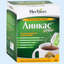 Получить консультацию по данному препарату| Состав и форма выпуска. | Форма выпуска: Линкас ОРВИ гранулы для приготовления раствора для приема внутрь коричневого цвета. Упаковка: В саше-пакете по 5,6 г №10 саше в упаковке. Состав: ивы белой коры - 750 мг адатоды сосудистой листьев - 300 мг фиалки душистой листьев и цветков - 100 мг солодки голой корневища с корнями - 550 мг чая китайского листьев - 125 мг фенхеля обыкновенного плодов - 75 мг эвкалипта шарикового листьев - 35 мг валерианы лекарственной корневища с корнями - 100 мг. Вспомогательные вещества: Левоментол 5 мг, крахмал кукурузный 20 мг, сахароза до 5,6 мг. |
