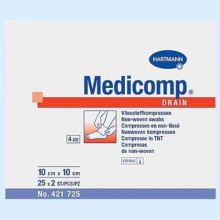 | Фармакологическое действие. | Medicomp steril - это стерильные салфетки для общей обработки ран в качестве тампонов и повязок в амбулатории и стационаре. MEDICOMP drain steril - это стерильная повязка с разрезом для катетеров и канюль. |