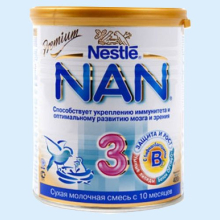 Получить консультацию по данному препарату| Описание. | Детская смесь Nan содержит еще больше необходимых питательных веществ для оптимального физического и умственного развития детей. Основные характеристики: - укрепляет иммунитет ребенка; - содержит нуклеотиды для быстрого восстановления слизистой оболочки кишечника; - бифидогенный эффект: комбинация питательных веществ поддерживает здоровую микрофлору кишечника, что усиливает естественную иммунную защиту организма ребенка; - содержит бифидобактерии, умные липиды и белок Optipro - DHA и ARA - незаменимый строительный материал для развития мозга; Цифра 3 означает, что смесь подходит для детей от 12 месяцев. Возраст: с 12 месяцев. Вес: 400 гр. |