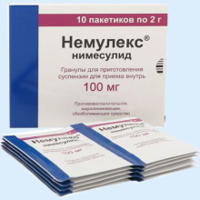 Получить консультацию по данному препарату| Состав и форма выпуска. | Форма выпуска, состав препарата Немулекс®: Гранулы для приготовления суспензии для приема внутрь желтоватого цвета приготовленная суспензия - светло-желтого цвета. 1 пак. нимесулид 100 мг. Вспомогательные вещества: макрогола цетостеарат (кремофор А25) - 100 мг, лимонная кислота безводная -19 мг, кремния диоксид коллоидный (аэросил) - 40 мг, сахароза - 1721 мг, ароматизатор апельсиновый - 20 мг. Упаковка: 10 шт. |