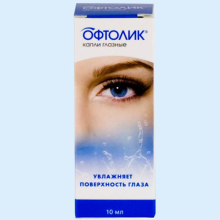 | Фармакологическое действие. | Препарат представляет собой кератопротектор, то есть используется только в случаях, когда необходимо дополнительное увлажнение глаз. При низком уровне секреции слезной жидкости Офтолик оказывает защитное действие на роговицу глаза. Аналогичное действие глазные капли оказывают и при высокой степени испарения слезной пленки. При применении Офтолика наблюдается уменьшение раздражения и покраснения глаз, что обеспечивается свойствами поливинилового спирта и повидона, которые действуют как лубрикант (способствуют увлажнению). Активные вещества капель попадая на поверхность глаза снижают ее напряжение и бережно обволакивают, предотвращая вероятность возникновения деформации слезной пленки. Поливиниловый спирт по своим свойствам аналогичен муцину, который продуцируется конъюнктивальными железами. При контакте со слизистой оболочкой глаза поливиниловый спирт способствует стабилизации состояния слезной пленки, параллельно смазывая и увлажняя поверхность глаза. |
