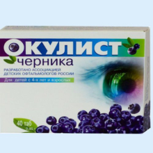 | Фармакологическое действие. | БАД Окулист - комплексный препарат, активные компоненты которого обеспечивают нормальное питание, жизнедеятельность и правильную работу глаз. Бета-каротин - принимает активное участие в процессах обмена, происходящих в сетчатке глаза. Достаточное поступление бета-каротина необходимо для хорошего цве-товосприятия, темновой адаптации глаз и сумеречного зрения. В организме бета-каротин превращается в витамин А, без которого невозможна нормальная жизнедеятельность сетчатки. Именно из витамина А в глазу создаются новые молекулы родопсина - светочувствительного вещества. Если витамина А не хватает, синтез родопсина будет замедляться, а может и вообще прекратиться. В ОКУЛИСТ входит тонко гранулированный бета-каротин в защитной матрице, что позволяет сохранять биологическую активность этого незаменимого для глаз вещества на высоком уровне. Антоцианы черники - вещества, которые придают ягоде ее насыщенный, темно-фиолетовый цвет. Они обладают ценнейшей для глаз способностью увеличивать скорость образования родопсина. Благодаря этому, антоцианы черники улучшают чувствительность сетчатки глаза к изменениям интенсивности света, усиливают остроту зрения при низкой освещенности. При этом ускоряется обновление сетчатки, снижается усталость глаз от продолжительной работы. Входящая в ОКУЛИСТ дикорастущая черника, благодаря особой технологии, сохраняет максимально возможное количество естественных антоцианов. Селен – играет роль преобразователя световой энергии в электрический нервный импульс. Ученые обнаружили содержание селена в сетчатке глаза, и выявили прямую зависимость между остротой зрения и содержанием этого элемента. Не зря значит, в глазах у зоркого орла селена в сто раз больше, чем у человека. У человека его оказалось немного - около 7 мкг, зато у зоркого орла - в 100 с лишним раз больше, 780 мкг. Поэтому очень важно, чтобы глаз не испытывал недостатка в селене. ОКУЛИСТ содержит органический источник биодоступного селена, обладающий очень важной особенностью: попадая в организм, этот селен сам стремится оказаться в тканях глаза. Дигидрокверцетин - уникальный компонент, улучшающий работу сети кровеносных капилляров в глазах. Важность этого трудно переоценить. Если капилляры работают плохо, если они закрыты или закупорены тромбами, ткани глаза не смогут получить необходимые им кислород и питательные вещества, даже если всего этого в организме будет в избытке. Дигидрокверцетин укрепляет стенки и регулирует тонус кровеносных сосудов, помогает раскрытию и включению в работу закупоренных капилляров, снижает риск образования тромбов и стимулирует кровоток в тканях глаза. Усиливается их питание, снабжение кислородом, улучшается отток продуктов обмена. Это помогает восстановлению поврежденных тканей, укрепляются мышцы и связки глаза, повышаются его зрительные функции и острота зрения, улучшается чувствительность и проводимость зрительного нерва, уменьшается дефицит полей зрения. Нормализуется проницаемость капилляров, повышается их прочность, что значительно снижает риск развития отеков и кровоизлияний в тканях глаза. Дигидрокверцетин, входящий в состав ОКУЛИСТА, - это натуральный флавоноид лиственницы сибирской, по праву занимающий одно из лидирующих мест среди природных антио