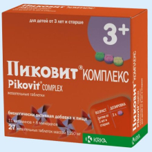 | Способ применения. | Пиковит принимают внутрь. Детям 5-6 лет по 1 жевательной таблетке в день во время еды с пищей, хорошо разжевывая, детям 7-14 лет - по 2 жевательные таблетки в день. |