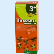 | Показания препарата. | Сбалансированный сироп Пиковит Пребиотик рекомендуется для детей старше 3 лет, в качестве дополнительного источника витаминов, источника пребиотиков (олигофруктозы). |