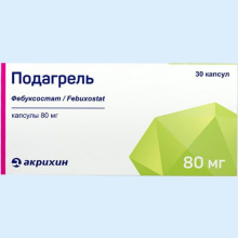 | Описание. | Меры предосторожности и особые указания: Применять строго по назначению врача. Прежде чем начать прием препарата Подагрель, проконсультируйтесь со своим врачом или работником аптеки, если у Вас: - почечная недостаточность тяжелой степени тяжести (клиренс креатинина <30 мл/мин) (эффективность и безопасность изучены недостаточно); - печеночная недостаточность; - серьезные аллергические реакции (реакции гиперчувствительности) в анамнезе; - ишемическая болезнь сердца; - застойная сердечная недостаточность; - заболевания щитовидной железы; - Вы одновременно применяете меркаптопурин/азатиоприн (возможно повышение концентрации данных веществ в плазме крови и усиление их токсичности); - состояния после трансплантации органов (опыт применения фебуксостата ограничен); - синдром Леша-Нихана (опыт применения фебуксостата ограничен); Острый приступ подагры (обострение подагры) Применение препарата Подагрель следует начинать только после купирования острого приступа подагры. Начало применения препарата Подагрель может спровоцировать развитие острого приступа подагры за счет высвобождения уратов из тканевых депо и последующего повышения концентрации мочевой кислоты в сыворотке крови. Для профилактики приступов подагры рекомендуется одновременное применение нестероидных противовоспалительных препаратов (НПВП) или колхицина в течение не менее 6 месяцев. При развитии приступа подагры во время применения препарата Подагрель терапию препаратом следует продолжить и одновременно проводить соответствующее лечение острого приступа подагры. При длительном применении препарата Подагрель частота возникновения и тяжесть приступов подагры уменьшаются. Отложение ксантинов В редких случаях у пациентов с ускоренным образованием уратов (например, на фоне злокачественных новообразований или при синдроме Леша-Нихана) возможно значительное повышение абсолютной концентрации ксантинов в моче, что может сопровождаться их отложением в мочевых путях. В связи с ограниченными данными применение препарата Подагрель у пациентов с синдромом Леша-Нихана не рекомендуется. Меркаптопурин/азатиоприн Одновременное применение с меркаптопурином, азатиоприном не рекомендуется. В случае необходимости одновременного применения для снижения токсического действия на систему кроветворения рекомендуется уменьшение дозы меркаптопурина/азатиоприна и тщательное медицинское наблюдение. Теофиллин При одновременном применении у здоровых добровольцев фебуксостата в дозе 80 мг 1 раз в сутки и разовой дозы теофиллина 400 мг не отмечалось изменений фармакокинетических показателей (см. раздел 4.5). Таким образом, одновременное применение фебуксостата в дозе 80 мг и теофиллина не несет риска увеличения концентрации теофиллина в плазме крови. Изучение одновременного применения фебуксостата в дозе 120 мг и теофиллина не проводилось. Пациенты, перенесшие трансплантацию органов Применение препарата Подагрель у пациентов, перенесших трансплантацию органов не рекомендуется в связи с отсутствием опыта применения. Аллергические реакции и реакции гиперчувствительности В период пострегистрационного применения имели место редкие сообщения о возникновении тяжелых аллергических реакций (реакций гиперчувствительности), включая жизнеугрожающий синдр