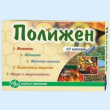 | Фармакологическое действие. | Полижен содержит в себе комплекс витаминов, минеральных веществ и аминокислот, необходимых для нормального функционирования организма, а также биологически активных веществ, которые повышают сопротивляемость организма к инфекционным, в том числе простудным, заболеваниям, вредным воздействиям окружающей среды и оказывают общее тонизирующее действие. Рационально подобранная комбинация витаминов, которые активно участвуют в различных биохимических процессах, оказывает благотворное разностороннее биологическое действие на организм минеральные вещества, природные химические элементы обеспечивают естественный химический баланс в организме. Аминокислоты являются основным строительным материалом для синтеза тканевых белков, ферментов, гормонов и других биологически важных соединений. Маточное молочко содержит витамины А, С, Е, группы В, аминокислоты, минеральные сопи кальция, железа, кремния, органические кислоты. Расширяет кровеносные сосуды, регулирует артериальное давление, поддерживает питание клеток, способствует преодолению усталости и стресса, стимулирует иммунную систему, клеточный метаболизм и регенеративные процессы. Обладает противовоспалительными, адаптогенными свойствами. Повышает иммунитет. Бутилгидрокситолуол обладает антивирусным действием, в частности, при использовании против семейства вирусов герпеса, особенно в комбинации с L-лизином и витамином С. Витамин А принимает участие в формировании зрительных пигментов, обеспечивает целостность эпителиальных тканей, регулирует рост организма. Витамин Д3 стимулирует всасывание из кишечника кальция, фосфатов и магния, активирует синтез белковой стромы костей и отложение кальция в костной ткани и дентине, препятствует резорбции костной ткани, способствует выведению свинца из организма. Витамин С играет важную роль в регулировании окислительно-восстановительных процессов, обеспечивает синтез коллагена, участвует в метаболизме фолиевой кислоты и железа, а также в синтезе стероидных гормонов и катехоламинов. Витамин Е обладает антиоксидантными свойствами, обеспечивает защиту ненасыщенных жирных кислот в мембранах клеток от окисления принимает участие в формировании межклеточного вещества, коллагеновых и эластических волокон. Витамин РР принимает участие в процессах тканевого дыхания, жирового и углеводного обмена. Витамин В13 как промежуточный продукт пиримидиновых оснований участвует в синтезе нуклеиновых кислот, усиливает образование альбуминов в печени, особенно в условиях длительной гипоксии, улучшает регенеративные функции, повышает анаболизм. Витамин В5 в качестве составной части коэнзима А играет важную роль в процессах ацетилирования и окисления, способствует построению и регенерации эпителия и эндотелия. Витамин В1 в качестве кофермента принимает участие в углеводном обмене, функционировании нервной системы. Витамин В2 - катализатор клеточного дыхания и зрительного восприятия, играет важную роль в формировании ДНК, способствует процессам регенерации тканей (в т.ч. клеток кожи). Витамин В6 в качестве кофермента принимает участие в метаболизме аминокислот, белков, а также в процессах синтеза нейромедиаторов. Витамин В9 необходима для нормального созревания мегалобластов и образования нор
