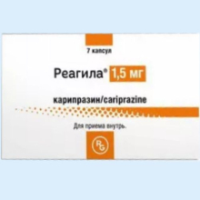 | Фармакологическое действие. | Реагила - это антипсихотическое средство (нейролептик). Предполагается, что терапевтический эффект карипразина обеспечивается комбинацией частичного агонизма по отношению к D3-, D2-дофаминовым рецепторам (величина Ki 0,085-0,3 нмоль/л в сравнении с 0,49-0,71 нмоль/л, соответственно) и 5-НТ1А-серотониновым рецепторам (величина Ki 1,4-2,6 нмоль/л) и антагонизма по отношению к 5-НТ2В- и 5-НТ2А-серотониновым рецепторам и Н1-гистаминовым рецепторам (значения Ki 0,58-1,1 нмоль/л, 18,8 нмоль/л и 23,3 нмоль/л, соответственно). |