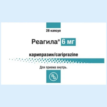 | Фармакологическое действие. | Реагила - это антипсихотическое средство (нейролептик). Предполагается, что терапевтический эффект карипразина обеспечивается комбинацией частичного агонизма по отношению к D3-, D2-дофаминовым рецепторам (величина Ki 0,085-0,3 нмоль/л в сравнении с 0,49-0,71 нмоль/л, соответственно) и 5-НТ1А-серотониновым рецепторам (величина Ki 1,4-2,6 нмоль/л) и антагонизма по отношению к 5-НТ2В- и 5-НТ2А-серотониновым рецепторам и Н1-гистаминовым рецепторам (значения Ki 0,58-1,1 нмоль/л, 18,8 нмоль/л и 23,3 нмоль/л, соответственно). |