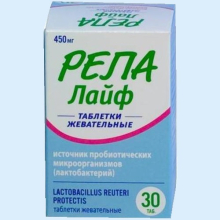 Получить консультацию по данному препарату| Состав и форма выпуска. | Состав: Рела Лайф таблетки жевательные: 1 табл. содержит живые лактобактерии Lactobacillus reuteri Protectis 10 млн КОЕ в упаковке 30 шт. |