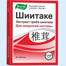 Получить консультацию по данному препарату| Состав и форма выпуска. | Форма выпуска: Таблетки, покрытые оболочкой. Упаковка: В блистере 20 таблеток. В упаковке 1 блистер. Состав: 1 таблетка, покрытая оболочкой, содержит: экстракт шиитаке сухой 250 мг, порошок гриба шиитаке 200 мг, витамин Д3 2,5 мкг. Вспомогательные вещества: целлюлоза микрокристаллическая, поливинилпирролидон, кальция стеарат, аэросил. Состав оболочки: гидроксипропилметилцеллюлоза, двуокись титана, полиэтиленгликоль, вода, краситель пищевой (Е104). |