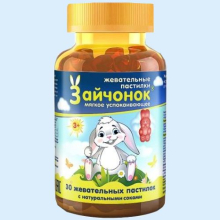| Показания препарата. | Рекомендуется для гиперактивных детей при чрезмерном беспокойстве, плаксивости, капризах, повышенной нервозности, а также при повышенных нагрузках и стрессах. Первое на рынке мягкое успокаивающее средство для детей в форме вкусных мармеладных зайчиков! Натуральный продукт с растительными экстрактами, витаминами и соками яблока и вишни. Входящие в состав экстракты ромашки, фенхеля, мяты, душицы и чабреца благотворно влияют на нервную систему, оказывают успокаивающее действие при гиперактивности, раздражительности, плаксивости, капризах, повышенной нервозности, а также при повышенных нагрузках и стрессах в период адаптации к детскому саду и школе. Рекомендовано в качестве биологически активной добавки к пище – дополнительного источника витаминов С и В6. Не содержит ГМО, искусственных красителей и консервантов. |