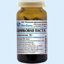 Получить консультацию по данному препарату| Состав и форма выпуска. | Форма выпуска: Паста для наружного применения. Состав: В состав 100 грамм препарата входит 25 грамм оксида цинка. Дополнительные вещества: картофельный крахмал, вазелин. Упаковка: 25 г. |